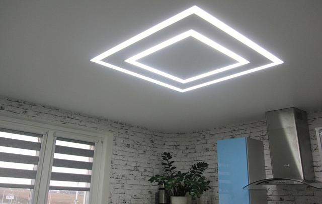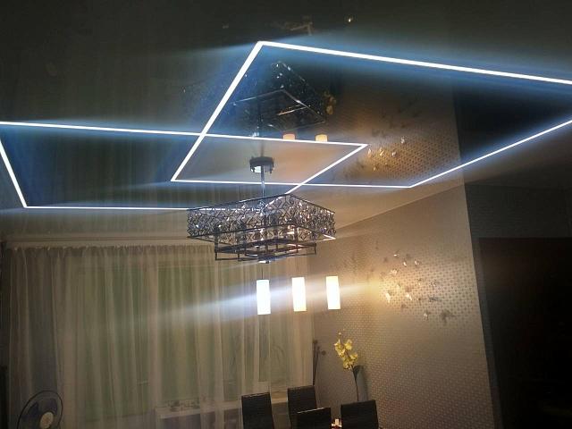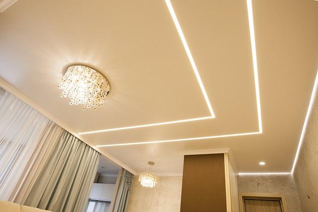 С помощью светящихся полос на потолке можно подчеркнуть основные элементы интерьера и разделить пространство на функциональные зоны. Для этого используются специальные профили со светопропускающей крышкой или без неё. Внутри профиля размещается светодиодная лента, а сам профиль устанавливается вровень с натяжным потолком.