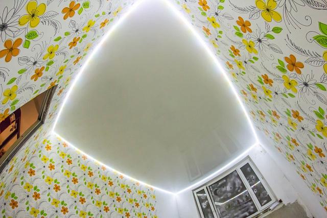Основная особенность парящего потолка, это тип его крепления, полотно не доходит до края стены заправляясь в профиль, в который устанавливают светодиодную ленту, она создаёт рассеянное свечение по стенам. Готовая конструкция выглядит так, как будто потолок парит в воздухе.